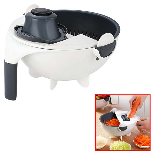 Set enthält: 6x austauschbare Klingen in verschiedenen Größen, 1x Schaber, 1x Schäler, 1x Schüssel mit Abtropfkorb.