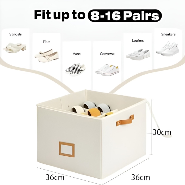 Der SHOVERA Schuh-Organizer ist für 8–16 Paar Schuhe ausgelegt, darunter Sandalen, Hausschuhe und Sneaker, in einer kompakten Größe von 36x36x30 cm. Sein faltbares Design ermöglicht eine einfache Aufbewahrung, wenn er nicht in Gebrauch ist – ideal für Zuhause, Studentenwohnheime und saisonales Schuhwerk.