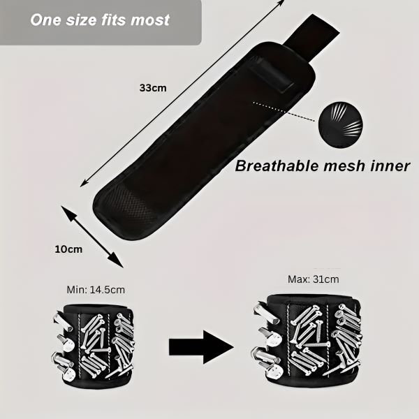 Die starken Magnete dieses Armbands lassen sich leicht um dein Handgelenk wickeln und halten kleine Metallgegenstände wie Schrauben, Nägel und Bolzen in greifbarer Nähe.