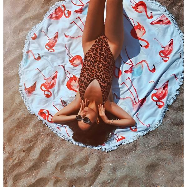 Das runde Handtuch eignet sich zum Entspannen am Strand oder am Pool, kann aber auch um den Körper gebunden als Kleidungsstück getragen werden.
