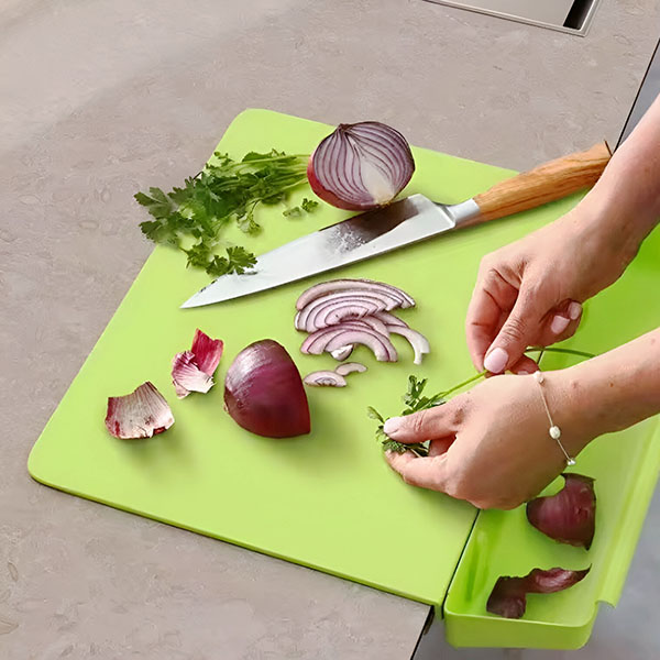 Halten Sie Ihre Arbeitsfläche makellos! Das integrierte Aufbewahrungsfach fängt Reste und gehackte Teile auf und beseitigt so das übliche Küchenchaos.